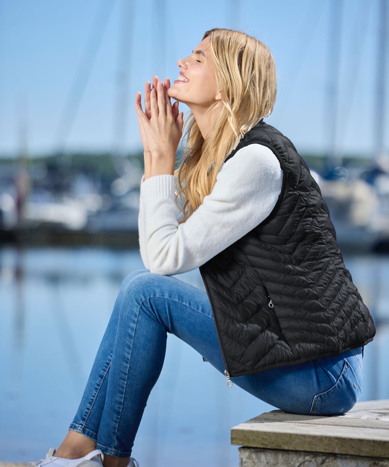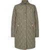 Lang quiltet jakke med trykknap lukning og sidelommer med lynlås samt slidser i siden. Jakkens silhouet er let oversize. Jakken er foret.